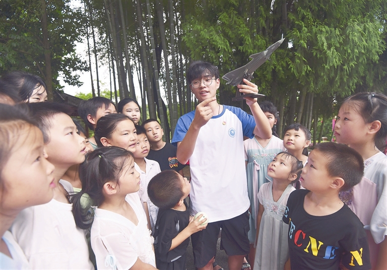 近日,南昌航空大学国际教育学院学生在资溪县乌石镇新月畲族村向孩子们介绍飞机模型。南昌航空大学8名师生走进山村,开展“播撒航空种子,放飞航空梦想”暑期“三下乡”社会实践服务活动,给留守儿童赠送学习用品,帮助他们筑起航空强国梦想。特约通讯员 吴志贵摄