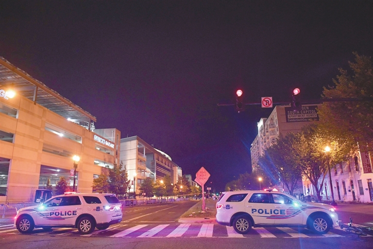 7月17日,警车封锁美国华盛顿“国民公园”棒球场附近的一条街道。 美国媒体17日报道,美国两支棒球队当晚在首都华盛顿一座棒球场比赛时,场外发生枪击事件,造成至少4人受伤,比赛被迫中断。 新华社/法新