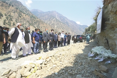 7月17日,中国赴巴基斯坦跨部门联合工作组组长、外交部涉外安全司副司长吴伟(前排左五)与中国驻巴大使农融(前排左四)带领现场人员集体肃立默哀。
