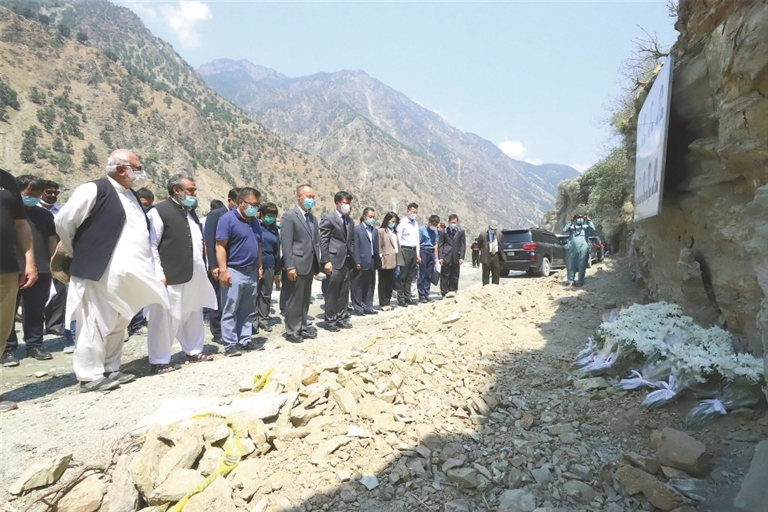 工作组与驻巴使馆工作人员一行17日乘坐巴军用直升机赶赴巴西北部开伯尔-普什图省达苏,吊唁在日前恐怖袭击事件中遇难的9名中国同胞。 新华社记者 蒋 超摄