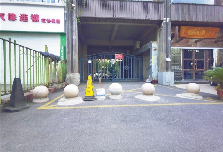 图❶消防通道上安设了石墩。本报记者 徐黎明摄