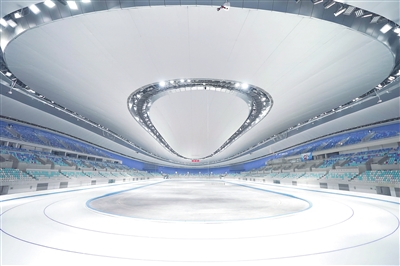 这是2021年1月22日拍摄的国家速滑馆“冰丝带”内景。国家速滑馆“冰丝带”是世界上第一个采用二氧化碳跨临界直冷系统制冰的大道速滑馆,也是冬奥历史上首个采用这项环保制冰技术的场馆。新华社记者 鞠焕宗摄