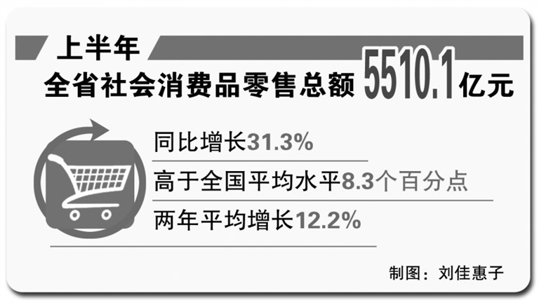本报讯 (记者刘佳惠子 实习生欧阳朋朋)有效控制疫情,江西消费坐上了回暖的高速列车。今年上半年,全省社会消费品零售总额5510.1亿元,同比增长31.3%,高于全国平均水平8.3个百分点,两年平均增长12.2%。