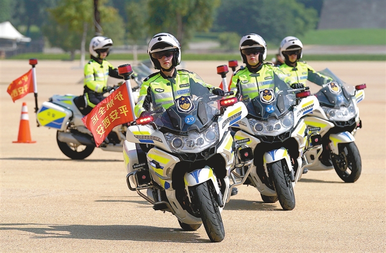 7月25日,西安市公安局交警支队女子铁骑在出征仪式上进行骑行表演。当日,由50名女警组成的西安市公安局交通警察支队女子铁骑队伍亮相古城。在出征仪式上,女骑警们进行了站立骑行、绕桩、隐蔽骑行等一系列铁骑表演,尽显巾帼风采。 新华社记者 刘 潇摄