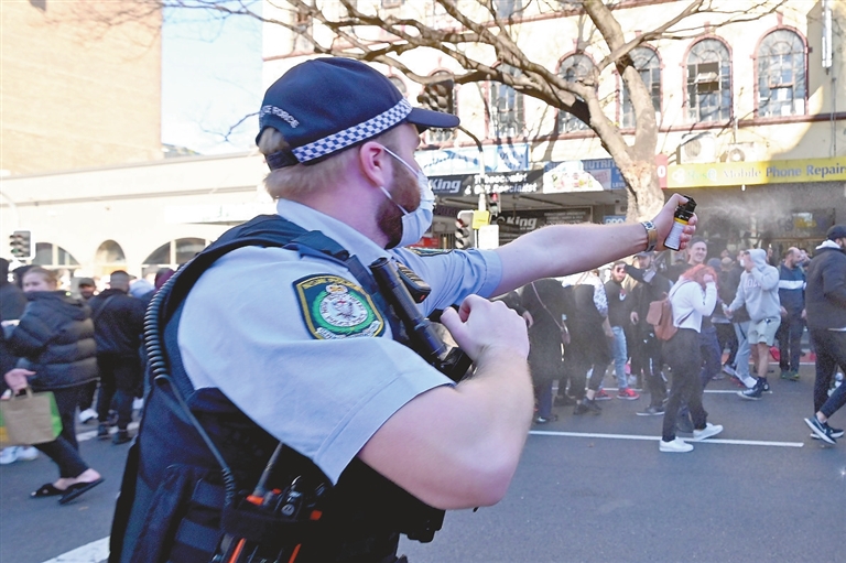 7月24日,在澳大利亚悉尼举行的抗议集会期间,一名警察用喷雾驱散抗议者。为防控新冠疫情,悉尼6月26日开始“封城”,经历数次延长,最新解封日期可能推迟至7月30日以后。数千人24日违反“居家令”,在悉尼市中心商业街集会,抗议“封城”举措,其间与警方发生暴力冲突。 新华社/法新
