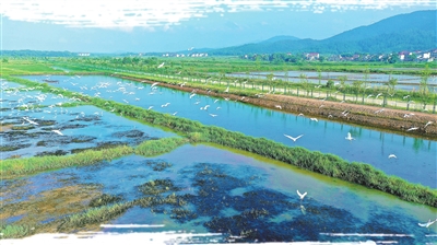 7月23日,吉水县盘谷镇同江万亩稻渔基地,无数的白鹭在这里觅食,绿水青山、蓝天白云和翩翩起舞的鹭鸟,构成一幅美丽的乡村生态画卷。特约通讯员 廖 敏摄
