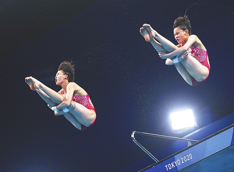 7月27日,中国选手陈芋汐/张家齐在比赛中。当日,在东京奥运会跳水女子双人十米跳台决赛中,中国选手陈芋汐/张家齐夺得冠军。新华社记者 许 畅摄