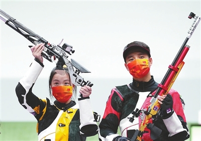 7月27日,杨倩(左)/杨皓然在赛后庆祝。当日,在东京奥运会10米气步枪混合团体决赛中,中国选手杨倩/杨皓然夺冠。