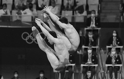 7月28日,中国选手谢思埸/王宗源在比赛中。当日,在东京奥运会男子双人三米跳板决赛中,中国选手谢思埸/王宗源获得冠军。新华社记者 丁 旭摄