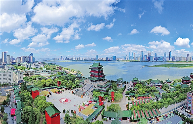 7月25日,蓝天白云下的南昌市赣江两岸,古色古香的滕王阁与现代化的高楼交相辉映,“南昌蓝”的生态美景,宛如一幅令人陶醉的风景画。 本报记者 李 劼摄