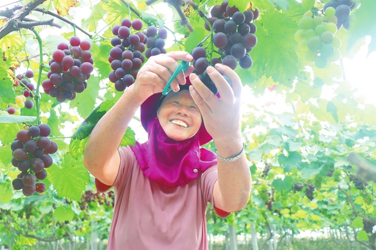 近日,在余干县乌泥镇铜鼓包村葡萄采摘园内,农民正在采摘葡萄。近年来,该县着力培育发展特色种植业,使之成为乡村振兴的重要支撑。通讯员 韩海建摄