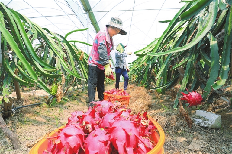 7月22日,在泰和县沙村镇绵溪村生态农业基地,农民正在大棚里采收火龙果。近年来,该县积极发展生态绿色农业,助力乡村振兴。特约通讯员 邓和平摄