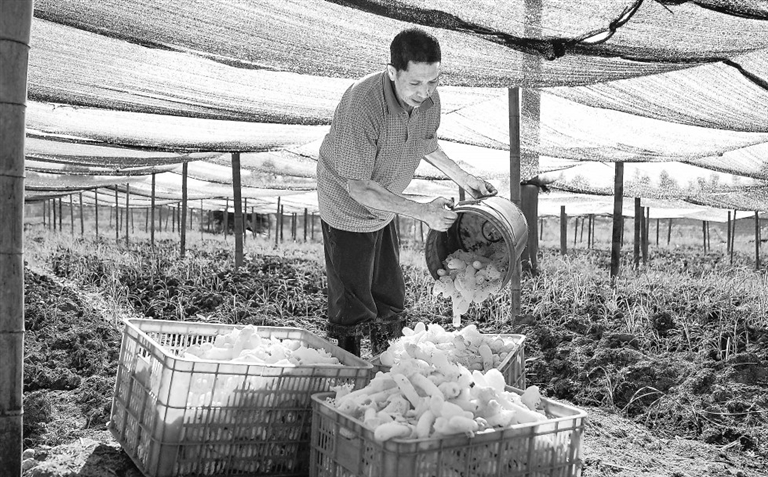7月22日,万载县湖源村种植基地,村民正忙着采摘成熟的竹荪。该种植基地能带动20多人就业,人均增收1500元。今年湖源村种植的20亩竹荪,预计每亩地可产干竹荪50公斤左右,目前市场供不应求。朱兆恺摄