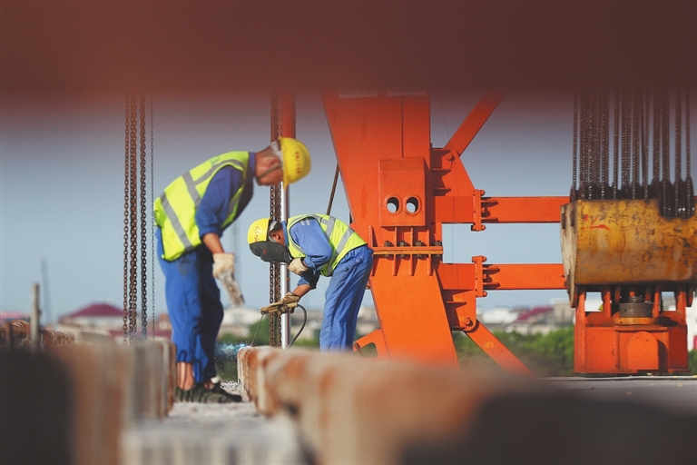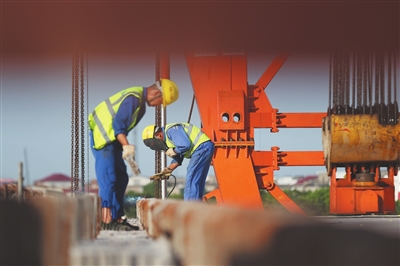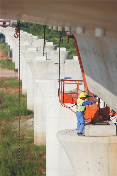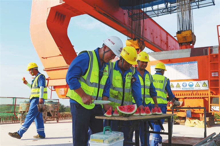 “为防止工人中暑,项目部调整了施工时间,避开高温时间段,并配备了防暑的医疗箱,为工人准备了绿豆汤、西瓜等防暑降温食品,保证了箱梁的顺利架设。”架桥机负责人张东勇介绍。
