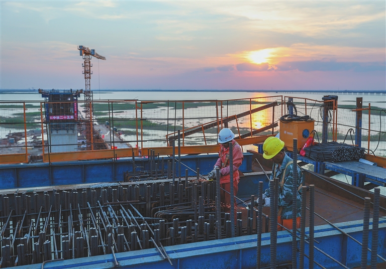 夕阳下,中铁二十五局昌景黄高铁五标段施工现场仍然忙碌一片,机械轰鸣,党旗飘扬,工人们挥汗如雨奋战在一线,忙着架梁、浇筑主墩。7月7日,昌景黄高铁金溪湖特大桥主跨83号墩第一节段顺利完成浇筑,标志着昌景黄铁路全线最重要的控制性工程——金溪湖特大桥的施工进入了快车道。