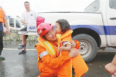 消防员将橡皮艇固定在楼道口后,跳入水中营救。“小朋友,不要怕,叔叔抱你出去。”消防员将孕妇和两个孩子逐一转移到橡皮艇。到达岸边,当邱紫豪将其中一个小女孩抱起放下时,小女孩就势送上一个吻:“谢谢消防员叔叔。”