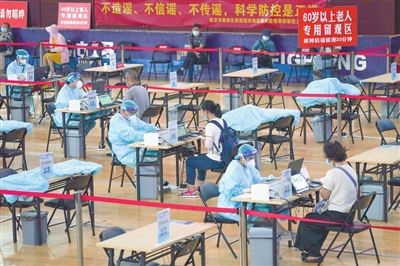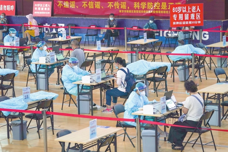 8月2日,市民在南京市鼓楼区五台山体育中心新冠病毒疫苗集中接种点登记信息,准备接种疫苗。