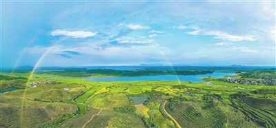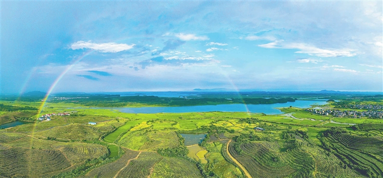 7月31日,一场风雨给鄱阳县江西小富茶业有限公司茶园披上两道绚丽的彩虹。近年来,鄱阳县充分利用鄱阳湖生态优势,积极引入民间资本,将荒山改造成茶叶基地和药材基地。本报记者 燕 平摄