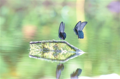 7月29日,分宜县钤山镇大岗山的一条小溪上飞来一种漂亮的蝴蝶——碧凤蝶。碧凤蝶属凤蝶科,大型蝶类,色彩艳丽,多产于热带亚热带地区。