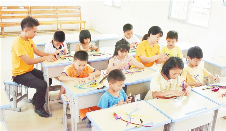 万年县汪家乡新建村上坪小组,有一个家门口暑托班,陈化武、蒋湖、蒋三根3名教师志愿者开设书法、围棋、手工等课程,让村里留守儿童过一个快乐的暑假。