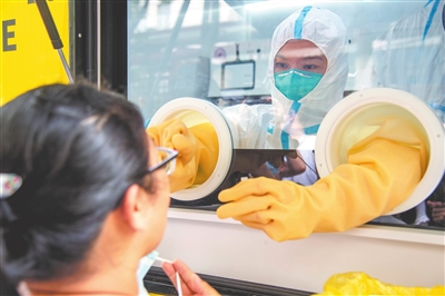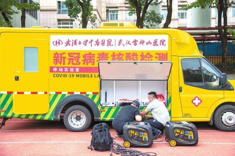 当日,来自武汉大学中南医院的移动核酸检测车驶入武昌区东湖路社区,为居民提供核酸检测服务。移动检测车外形如同一辆轻型客车,内部搭载核酸咽拭子采样机器人、快速灭活仪和5G检测直报系统等全自动、便携式一体化新冠病毒核酸检测设备,通过“人工+机械”两种方式取样,在45分钟内就能得出核酸检测结果,为武汉市全市全员核酸检测提供有力支持。 新华社发 (伍志尊摄)