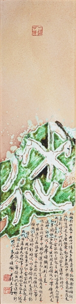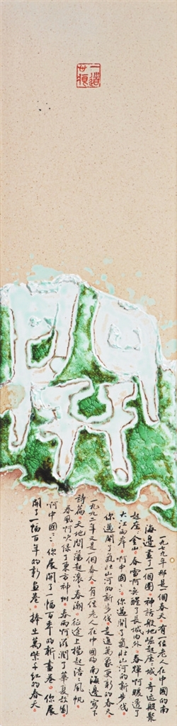 二是工艺的多样性。书法在陶瓷上的呈现,一般借助许多工艺手法,如釉上釉下、阴雕阳雕等。这些工艺的运用,体现出书法与陶瓷的融合进入了一个新阶段,追求陶瓷语言与书法艺术更深层次的结合,以达到审美上的更高统一。本次展出的陶瓷书法作品,充分展示了陶瓷的材质之美、工艺之美和书法的笔墨韵味之美。如邓贤达的作品,以影青雕刻镶器为载体,运用墨彩和矾红彩,红黑相间,色调朴实沉稳。汪开潮的《继往开来》四条屏,形式别开生面,大篆“继”“往”“开”“来”四个大字,每屏一字,为高温颜色釉,绿底色以突出四字主体;每条屏下方的小字为釉上书写,内容分别为《唱支山歌给党听》《东方红》《春天的故事》《走进新时代》歌词,黑字加红色句读,颇有古意。