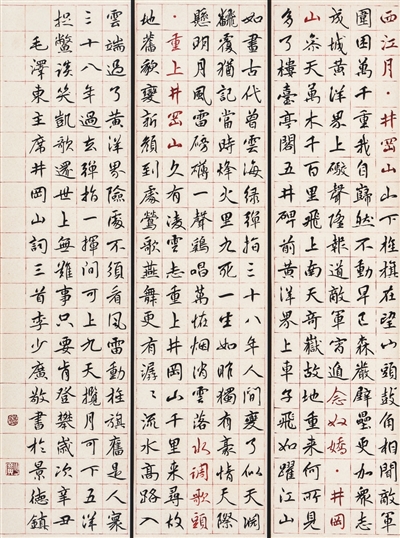 一是书法艺术的主体性。书法成为在陶瓷上创作的主体,书法的纯粹性得到体现,这是与以往陶瓷上文字作为点缀或衬托地位最明显的不同。如李少广的陶瓷书法作品,为竖幅三条屏,单字字径约5厘米,内容为毛泽东三首描写和回忆井冈山革命斗争时期的词作,书体为“二王(王羲之、王献之)”一路行书,结字平正欹侧,映带自然。