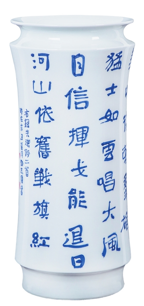 三是主题的鲜明性。陶瓷书法创作者创新意识在不断增强,往往会根据器型特点等,预先进行形式设计,从而更好地将个人的文化素养、审美情趣、思想境界、书法功力和工艺技术表现出来,力求达到形神合一,赋予陶瓷书法作品时代性。此次展览作品内容多为红色题材,一些作者创作过程中选择庄重的书体,以此表达对老一辈无产阶级革命家的崇高敬意和对党的无限深情。