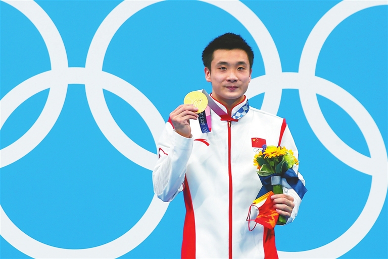 8月7日,中国选手曹缘在颁奖仪式上。当日,在东京奥运会跳水男子10米跳台决赛中,凭借最后一跳5255B近乎完美的发挥,压轴登场的中国选手曹缘最终以总分582.35的成绩摘得男子10米台金牌,杨健以1.95分的劣势屈居亚军。本场比赛过后,中国跳水“梦之队”在东京奥运会上以7金5银收官。
