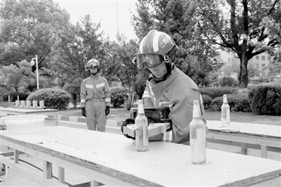 近日,在抚州市东乡区消防救援大队训练场上,消防员们冒着酷暑演练液压工具夹啤酒瓶、电锯割钢丝等项目,提升心理素质,增强救援水平。