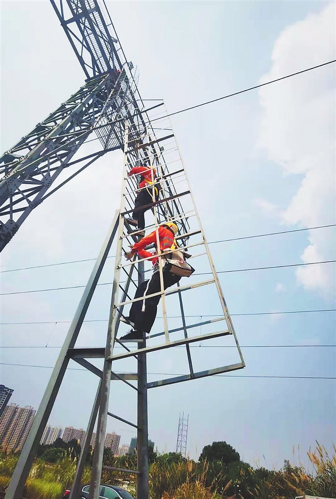正午的阳光非常热辣,空气仿佛一点就着,灯桥全金属构架非常烫手,电力线路工必须戴着手套才能攀爬上去。他们爬上22米高的桥顶时,衣服早已湿透。而对于这样的工作环境,大家习以为常。