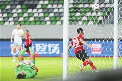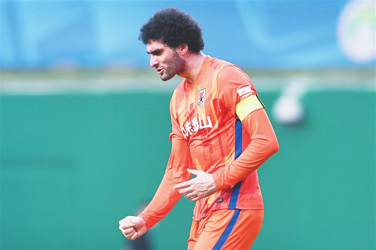 山东泰山队球员费莱尼在进球后庆祝。在2021赛季中国足球协会超级联赛(广州赛区)第13轮比赛中,山东泰山队以3∶1战胜广州城队。新华社发