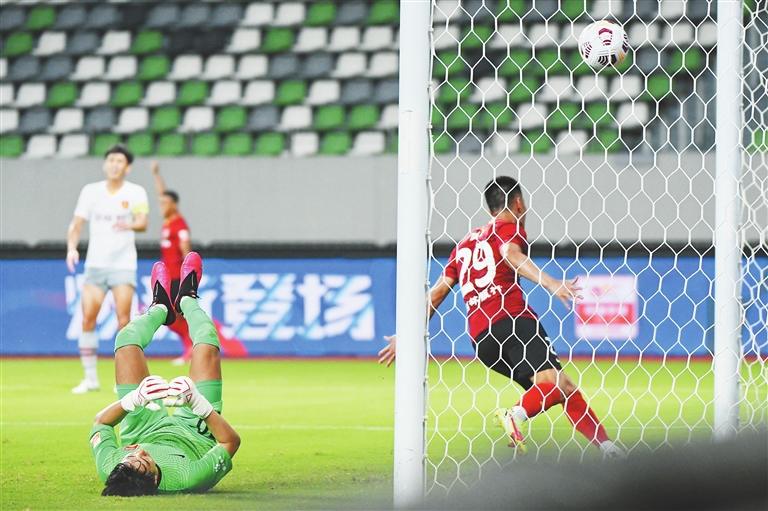 8月9日,长春亚泰队球员谭龙(右)在比赛中庆祝进球。 当日,在2021赛季中国足球协会超级联赛第一阶段(苏州赛区)第13轮比赛中,长春亚泰队以3∶0战胜河北队。 新华社发 (史 康摄)
