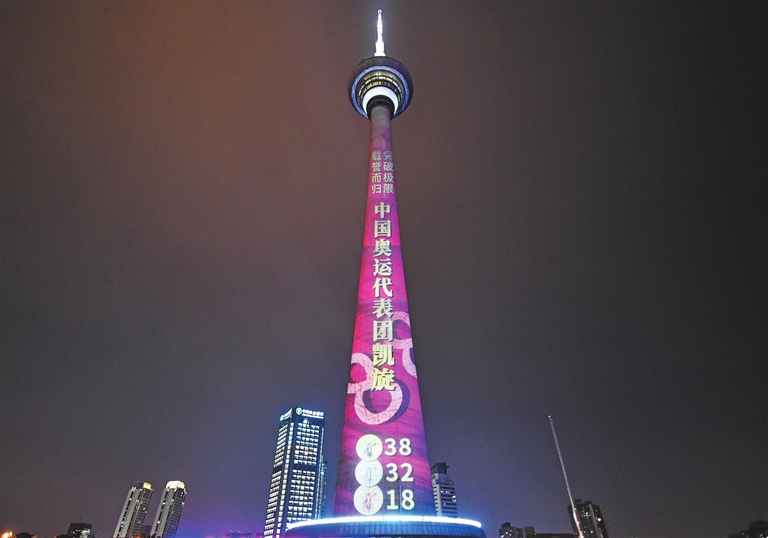 当晚,天津市地标建筑天塔被点亮,致敬刚刚结束东京奥运会之旅的中国体育代表团。新华社记者 赵子硕摄