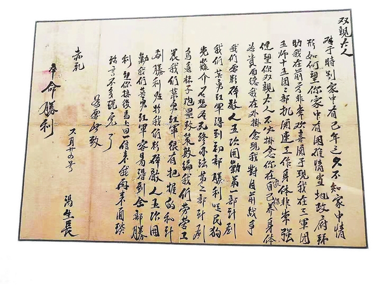 这是一页页残破泛黄的毛边纸,这是一封封墨迹依旧清晰的红色家书,“双亲大人……此致赤礼,奉命胜利!”