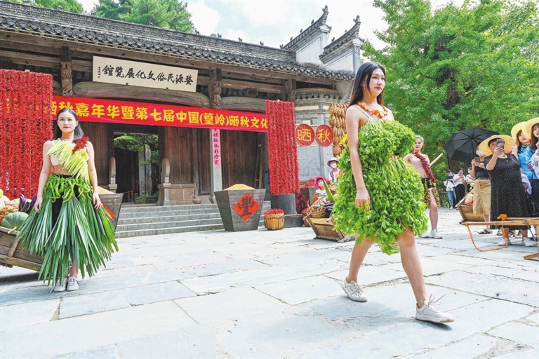 8月7日,婺源县篁岭村村民用辣椒、豆角等制成服装,进行服装秀“晒台”表演。当日是立秋,该村举行第七届晒秋文化季,创意十足的晒文化的服装秀表演,吸引着众多群众驻足拍摄、观看。通讯员 王国红摄