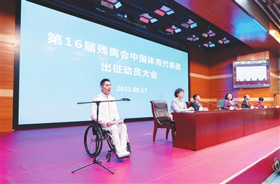8月17日,运动员代表冯攀峰在动员大会上发言。 当日,第16届残奥会中国体育代表团出征动员大会在京举行,代表团将于8月19日起分4批赴东京参加残奥会。新华社记者 才 扬摄