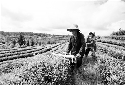 8月17日,靖安县仁首镇大团村村民在操作机械采收秋茶。今年,该县发展精深加工壮大茶叶产业,促进农民增收。