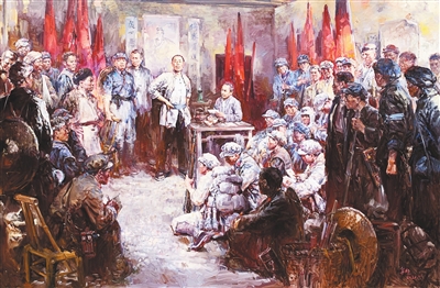 油画《长岭会议》,是我省画家栾布的作品,画面艺术再现了当年中央分局和赣粤边特委召开长岭会议的情景。为创作这件作品,作者从收集史料开始,做了大量的阅读工作,从画面的构思、草图的安排设计,到提交史论专家审阅,不断修改完善,数易其稿,用了几个月的时间。