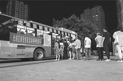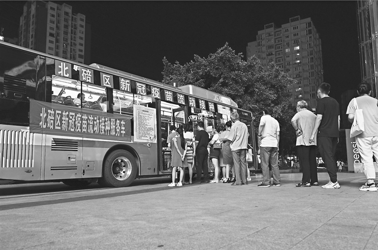 8月20日晚,在重庆市嘉陵风情步行街,人们在排队等待接种新冠疫苗。日前,重庆市北碚区北温泉街道在嘉陵风情步行街开通了夜间新冠疫苗接种服务车,接种时间从18点开始到22点结束。连日来,当地采取定点与流动相结合的方式,把疫苗接种流动服务车开进工地、学校、工厂等地,方便人们就近接种疫苗。 新华社发 (秦廷富摄)