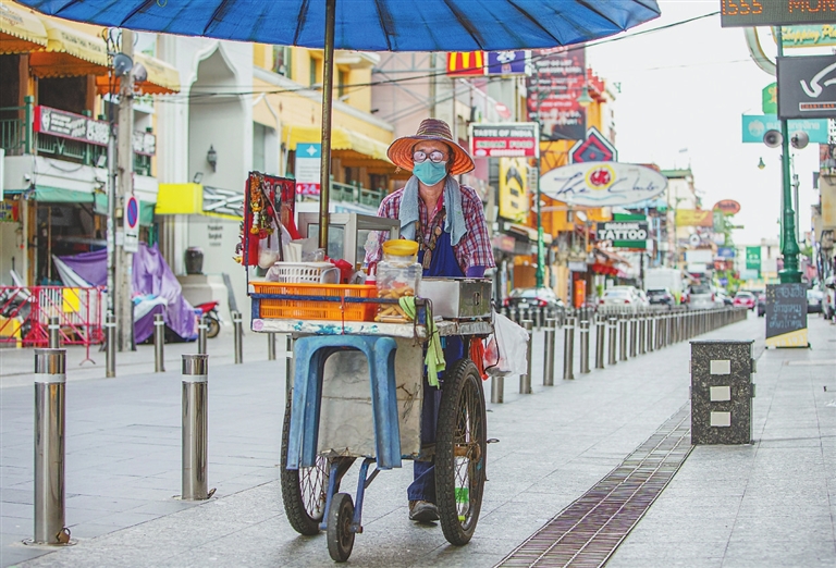 8月19日,在泰国曼谷,一名戴口罩的商贩推车走过考山路。据泰国新冠疫情管理中心20日公布的数据,该国当日新增新冠确诊病例19851例,累计确诊1009710例。