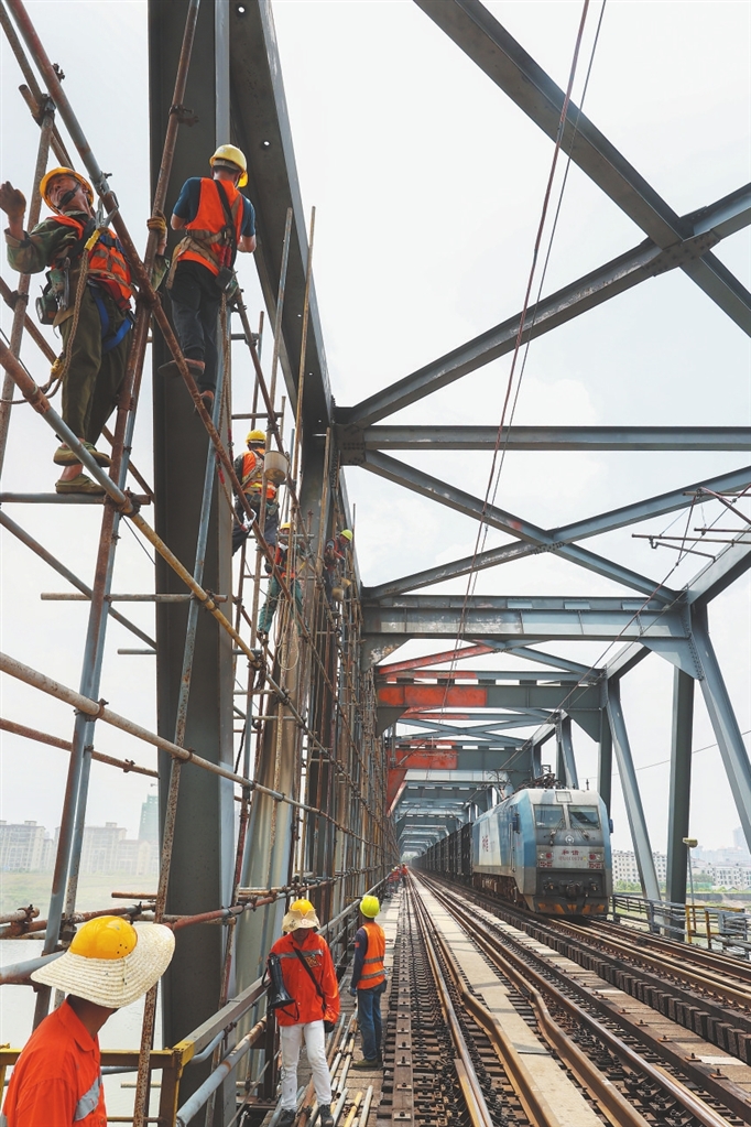 樟树大桥全长3068.64米,是沪昆铁路的一处咽喉要道,每天有80多对旅客列车从该桥经过。由于大桥“服役”年限较长,大桥部分钢结构出现漆面剥落、零部件老化等问题。为确保列车运行安全,近期鹰潭工务机械段的工人们,每天利用三四个小时,对横跨赣江的樟树大桥进行喷砂除锈养护作业。