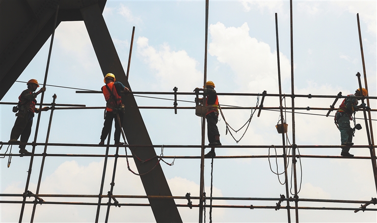 7月19日,滚滚热浪中,中国铁路南昌局集团有限公司鹰潭工务机械段的铁路工人叶江萍与工友们穿戴好防护用具后,沿着大桥钢梁一侧搭设好的脚手架攀爬而上。今年37岁的叶江萍是江西萍乡人,从事喷砂涂装作业已有十几年,是个老师傅。但是在高温下登上30余米的高空进行喷砂涂装作业,仍得小心谨慎。