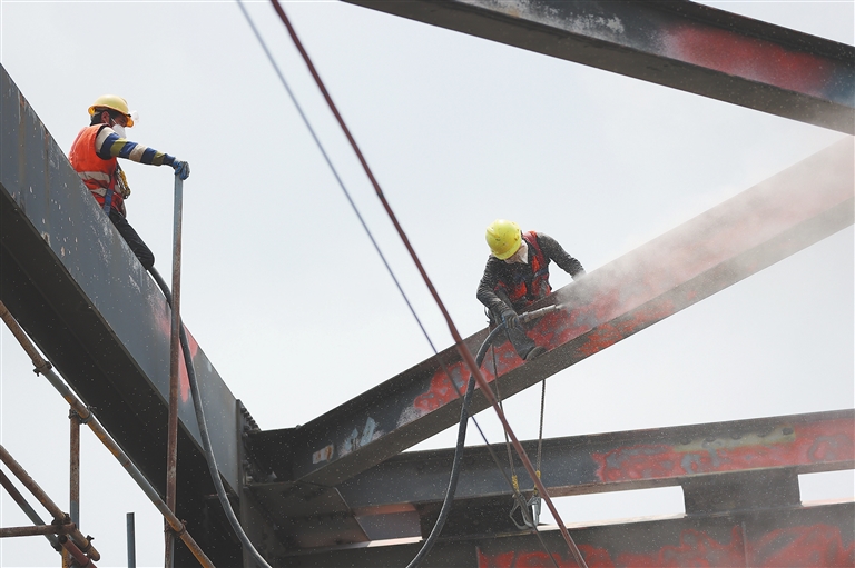 喷砂作业后,大部分老化的油漆被除掉。后续,工人们还要及时喷涂底漆,确保钢梁不再生锈。