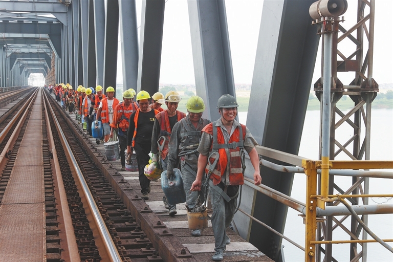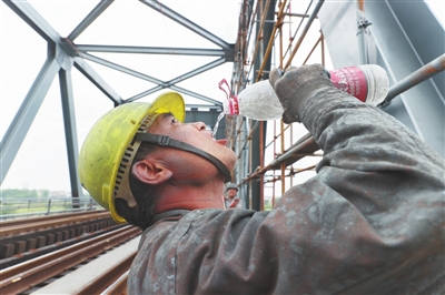 12时30分,当天的施工作业临近结束,工人们陆续返回桥面,他们的工装已经变得“色彩斑斓”。叶江萍顾不上擦拭脸颊和脖子上的砂粒和灰尘,拿起一瓶水大口地喝了起来。“我们就像是铁路上的‘蜘蛛侠’,工作就是为钢梁‘洗脸美颜’。只要大桥安全了,我们的工作就有意义。”