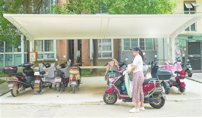 8月23日,南昌市青云谱区徐家坊街道内,电动车在新建成的光伏充电车棚里有序充电。据了解,该街道光伏充电车棚已建成12个,在建17个,小区过去楼道车辆乱停现象不复存在。
