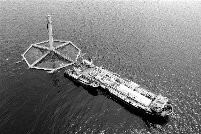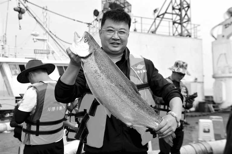 自山东日照东行百余海里,黄海冷水团中,“深蓝1号”犹如襁褓一般,“呵护”着游弋其间的三文鱼。茫茫大海中,这个有着两个足球场大小、重1500吨的八角网箱,它实现了我国在温暖海域养殖鲑鳟冷水鱼类的世界性突破,并将优质蛋白生产的主战场推进至深远海。