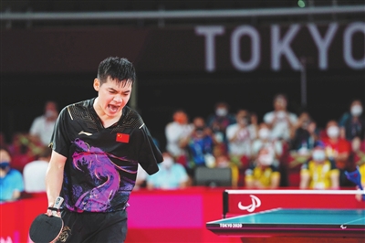 8月30日,中国选手赵帅在得分后庆祝。当日, 在东京残奥会乒乓球男子单打8级决赛中,中国选手赵帅以3∶1战胜乌克兰选手维克多,夺得金牌。新华社记者 张金加摄