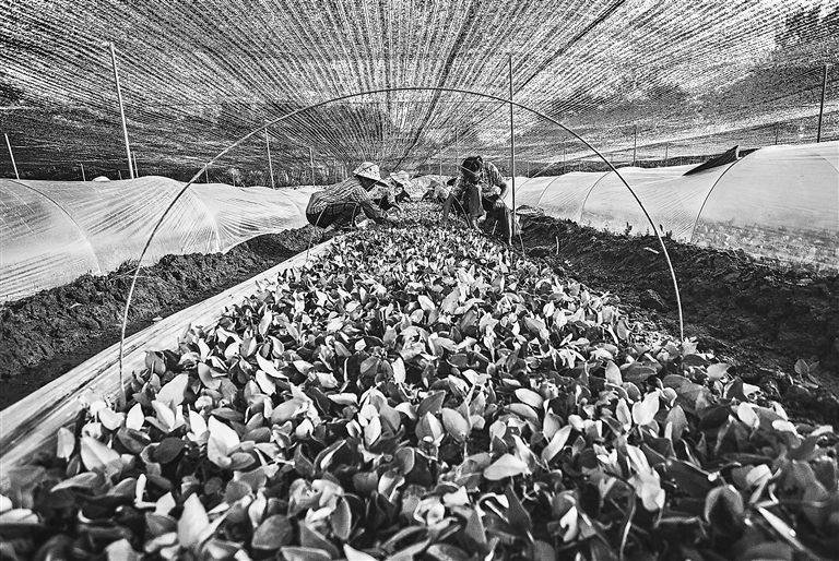 8月30日,湖口县付垅乡徐凤村千余亩苗圃内苗木长势喜人,农户正在翻地移苗。近年来,湖口县积极调整农业种养结构,加快推进“一村一品”建设,持续壮大村级集体经济。特约通讯员 张 玉摄