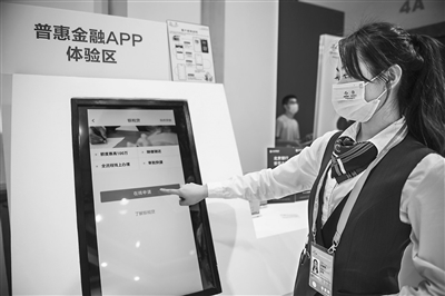 9月4日,工作人员在国家会议中心展区北京银行展位介绍普惠金融APP。9月2日至7日,2021年中国国际服务贸易交易会在北京举行。服贸会上的各类金融产品展现出金融服务领域的成果与亮点。新华社记者 陈钟昊摄